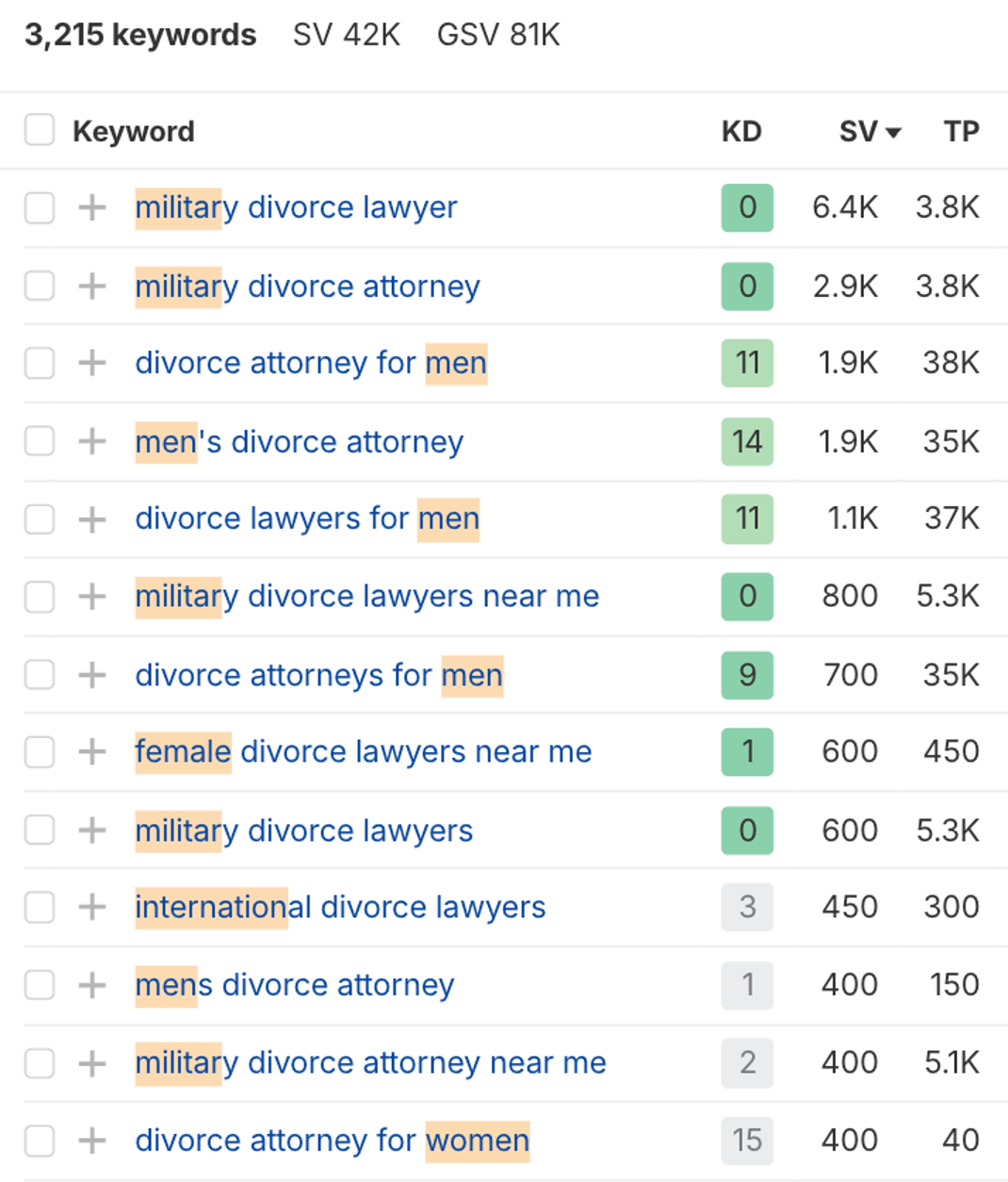 In the US, there are over 3,000 keywords for divorce attorneys who specialize in working with specific audience demographics like women, men, military or international clients.
